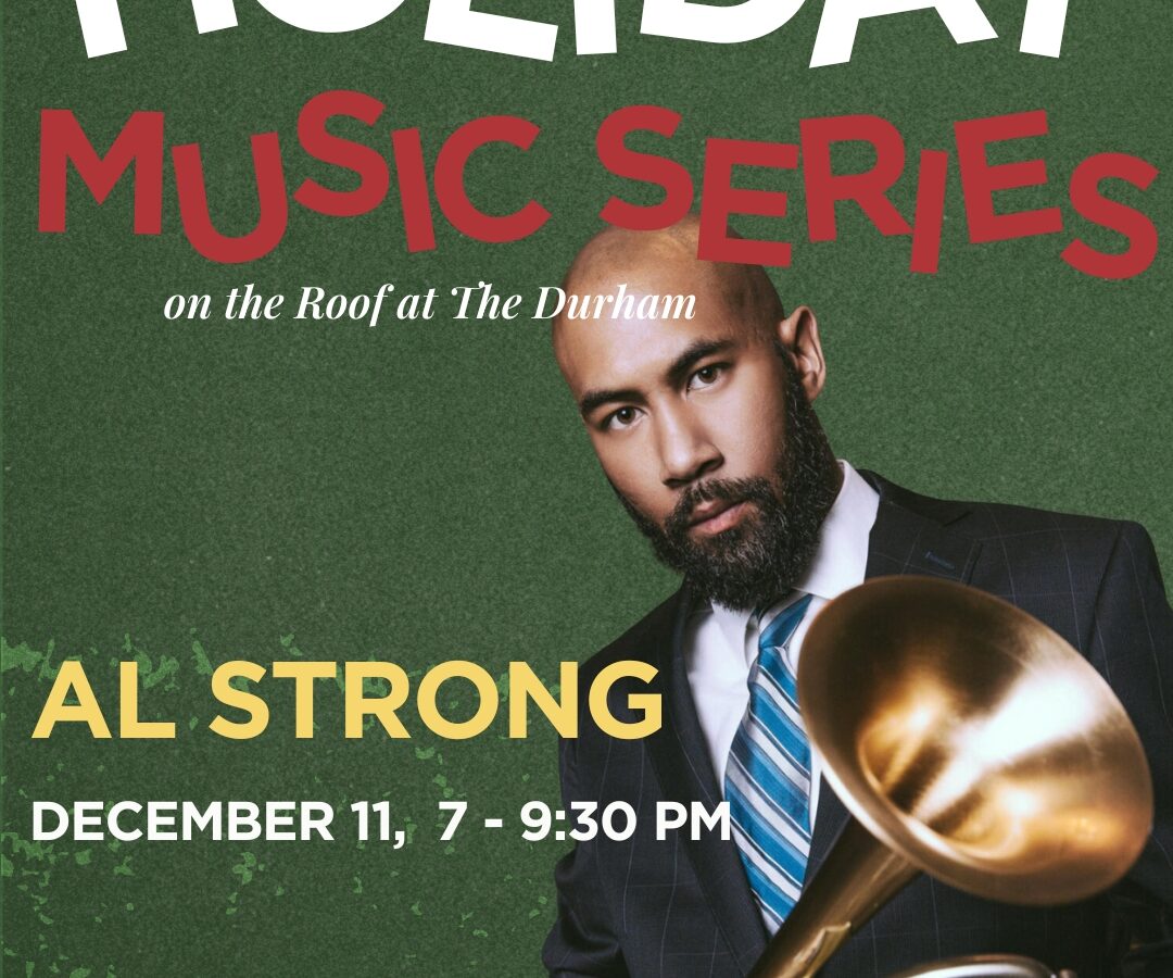 Join us Thursday, December 11, from 7–9:30 pm on the Roof for a special Holiday Edition of Al Strong Presents, featuring Durham’s own two-time Grammy-nominated trumpet player, composer, recording artist, and educator, Al Strong. Gather with friends and enjoy an evening of live jazz and holiday classics high above downtown Durham, paired with festive hot toddies and seasonal treats on our heated rooftop.